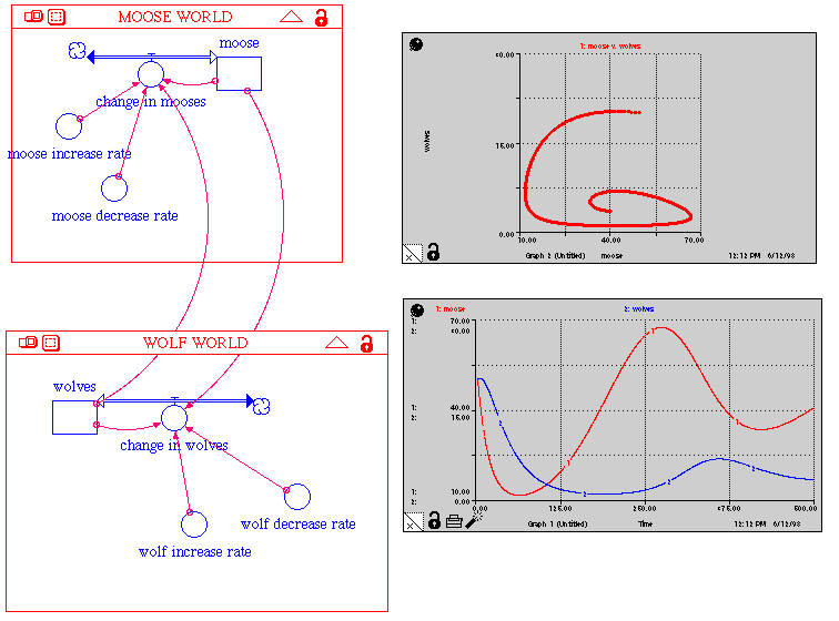 Suppose the predator species is wolves and the prey species is moose as on Isle Royale in Lake Superior. Click once on the picture to see an enlarged, more readable version. Notice that the populations cycle, with the predator peaking right after the prey. Competition in the Prey (1930s): The primary objection to the LV Model was that the prey (x) would increase without bound if the predators died out. What if competition among the prey is also incorporated?