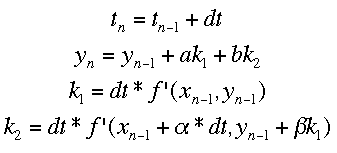 Runge-Kutta MethodsThe Runge-Kutta methods use multiple different approximations to the next value of y and average them. The equations for the process with two approximations (Runge-Kutta 2 method) is shown below.