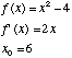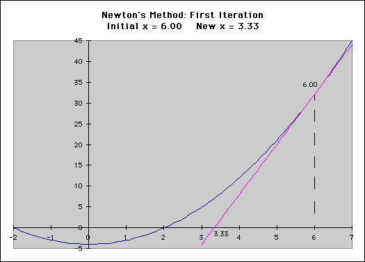 A graphical representation can also be very helpful. Below, you see the same function f(x) = x2-4 (shown in blue). The process here is the same as above. In the first iteration, the red line is tangent to the curve at x0. The slope of the tangent is the derivative at the point of tangency, and for the first iteration is equal to 12. Dividing the value of the function at the initial x (f(6)=32) by the slope of the tangent (12), we find that the delta-x is equal to 2.67. Subtracting this from six (6) we find that the new x-value is equal to 3.33. Another way of considering this is to find the root of this tangent line. The new x-value (xn+1) will be equal to the root of the tangent to the function at the current x-value (xn).
