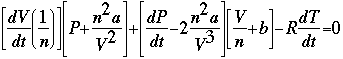As you can see, the Van der Waals equation is quite complex. It is not possible to solve it algebraically, so a numerical method must be used. The Newton-Raphson Method is the easiest and most dependable way to solve equations like this, even though the equation and its derivative seem quite intimidating. Depending on the conditions under which you are attempting to solve this equation, several of the variables may be changing. So, it may be necessary to use partial derivatives. For the purposes of this example, we are assuming that pressure, temperature, and volume are the only things changing, and that these values are all functions of time. This avoids the use of a partial derivative; we simply differentiate all variables with respect to time, as shown above. Some algebraic manipulation of the equation and/or its derivative may be needed depending on the specific problem to be solved. It is assumed that all of the variables but one are specified; that variable is used in the expression for "xn+1" that Newton's method uses. Performing Newton's method on this equation successfully would give a value of that variable which gives a solution when the other variables are held constant at the values you specified. Newton's Method Equation Solver: An Online Interactive Tool [Mathematics Index [Basic Matrix Math] [Linear Least Squares] [Newton's Method] [Integration Techniques] |