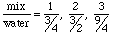 ![]() Notice that these ratios all reduce to the same decimal using a calculator, 1.3333333, which we may interpret as 1.3333333 parts mix to one part water ( 1.3333333 : 1 ). Notice that order is important in a ratio; the convention is to put the first quantity -- for us the mix amount -- in the numerator (top of fraction) and the second -- the water -- in the denominator (bottom).