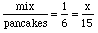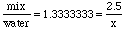 So we need 2.5 cups of mix for 15 pancakes. How much water? Using the ratio we found above for mix to water, 1.3333333, and solving: ![]() 1.3333333 x = 2.5